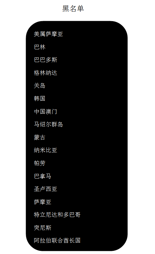 不合規的地區或國家被列入黑名單或顯示為灰色。第一份名單于2017年12月5日發布,當時有17個國家和地區被列入黑名單。具體包括的國家和地區如下圖所示,馬歇爾赫然在列。