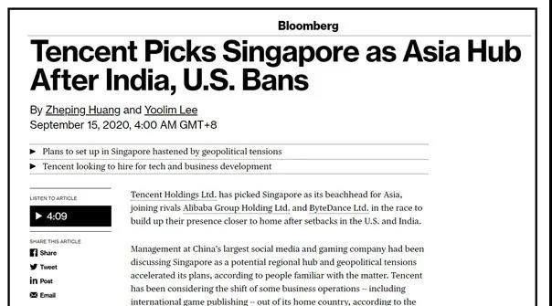 9月15日,繼阿里巴巴和字節(jié)跳動之后,騰訊集團也選擇在新加坡設(shè)立其在亞洲其他地區(qū)的橋頭堡。